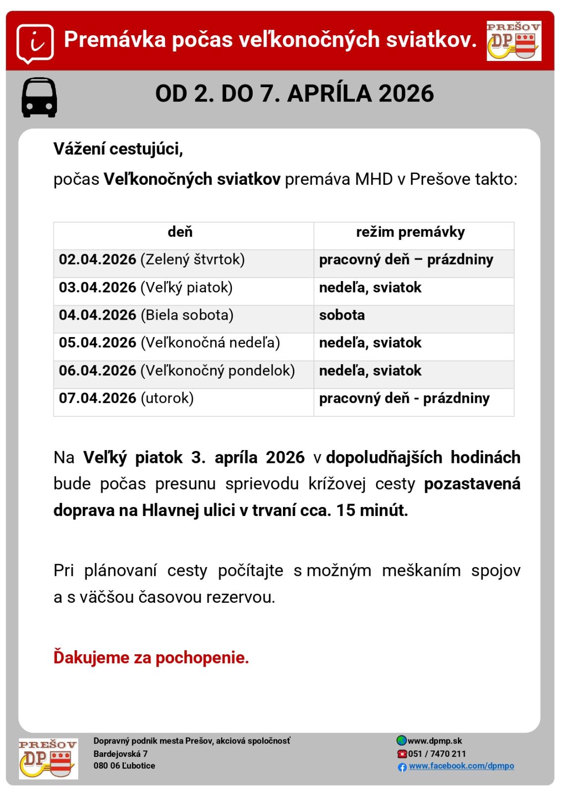Podľa informácií mesta a spoločnosti Dopravný podnik mesta Prešov bude MHD premávať v období veľkonočných sviatkov podľa upravených cestovných poriadkov. Cestujúci by preto mali pri plánovaní ciest počítať s obmedzeniami a skontrolovať si aktuálne odchody spojov.