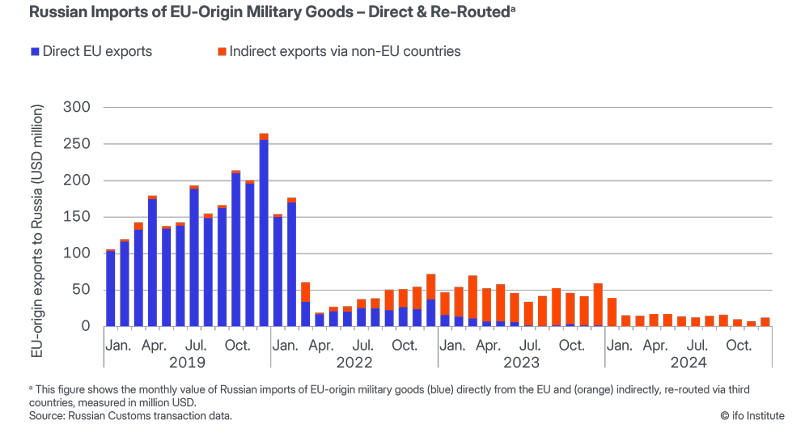 Štúdia upozorňuje, že sankcie, ktoré boli sprísnené od začiatku roku 2024, znížili rozsah týchto nepriamych dodávok. V posledných troch mesiacoch roku 2024 predstavoval vývoz vojenského vybavenia z EÚ do Ruska cez tretie krajiny približne 6 % úrovne pred začiatkom vojny, zatiaľ čo v predchádzajúcich rokoch 2022–2024 sa pohyboval na úrovni 13–24 %.